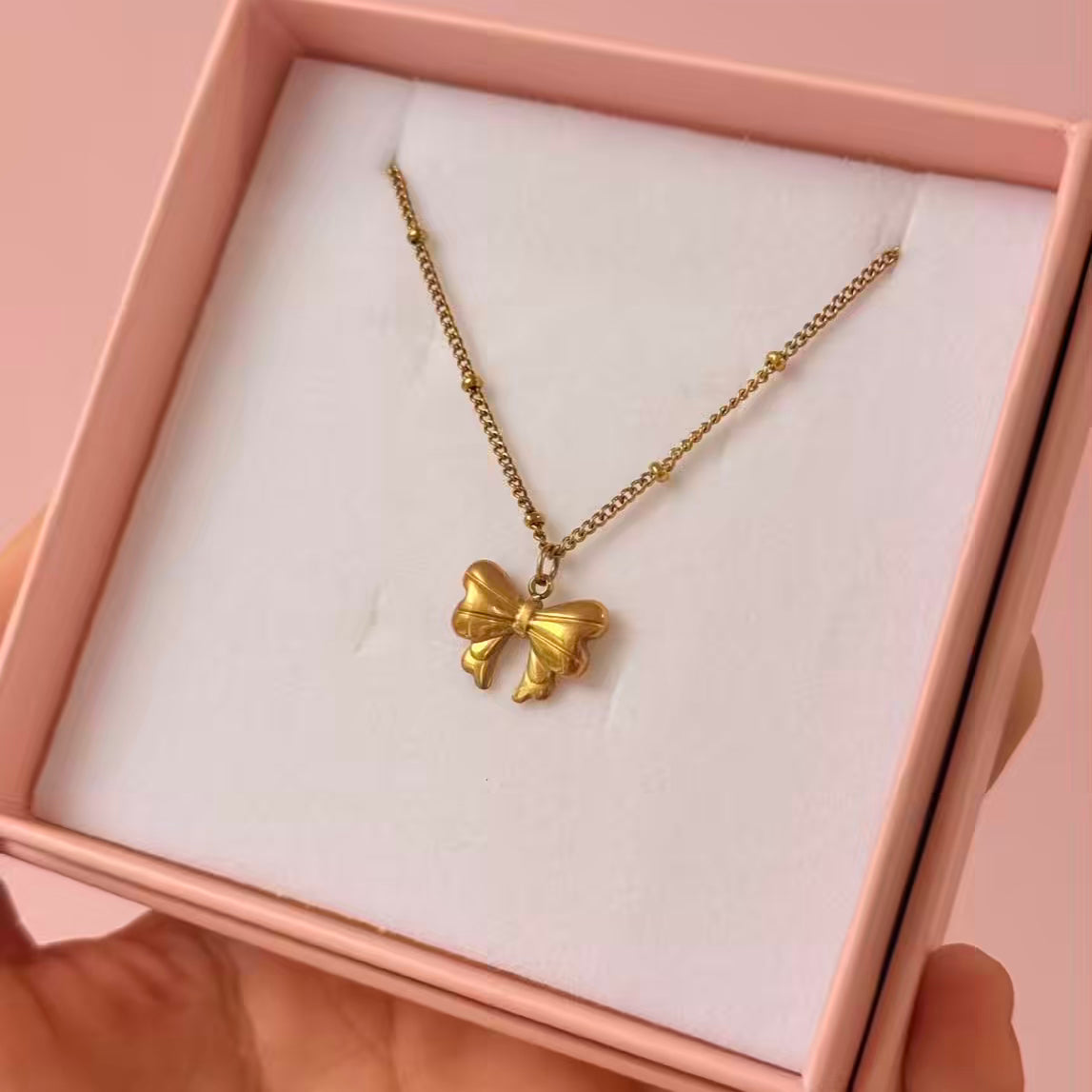 Cadena minimalista con un dije de lazo, hecha en Acero Inoxidable para que luzca fabulosa y la puedes usar todos los días.