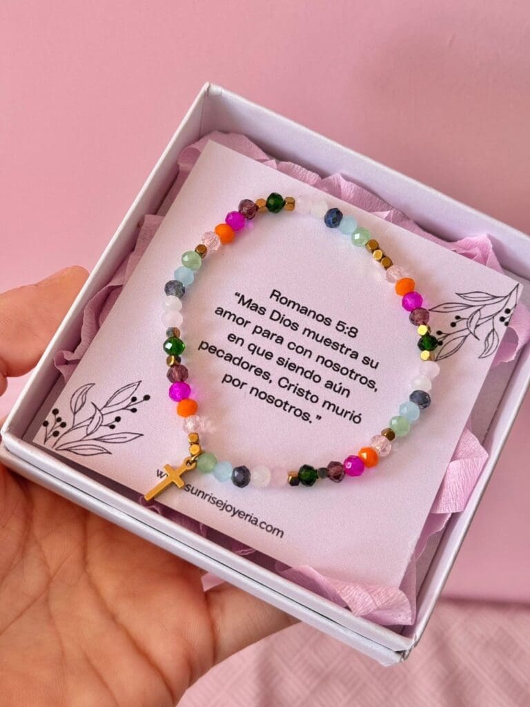 Pulsera elástica de cristales checos y con dije de Cruz en acero inoxidable.